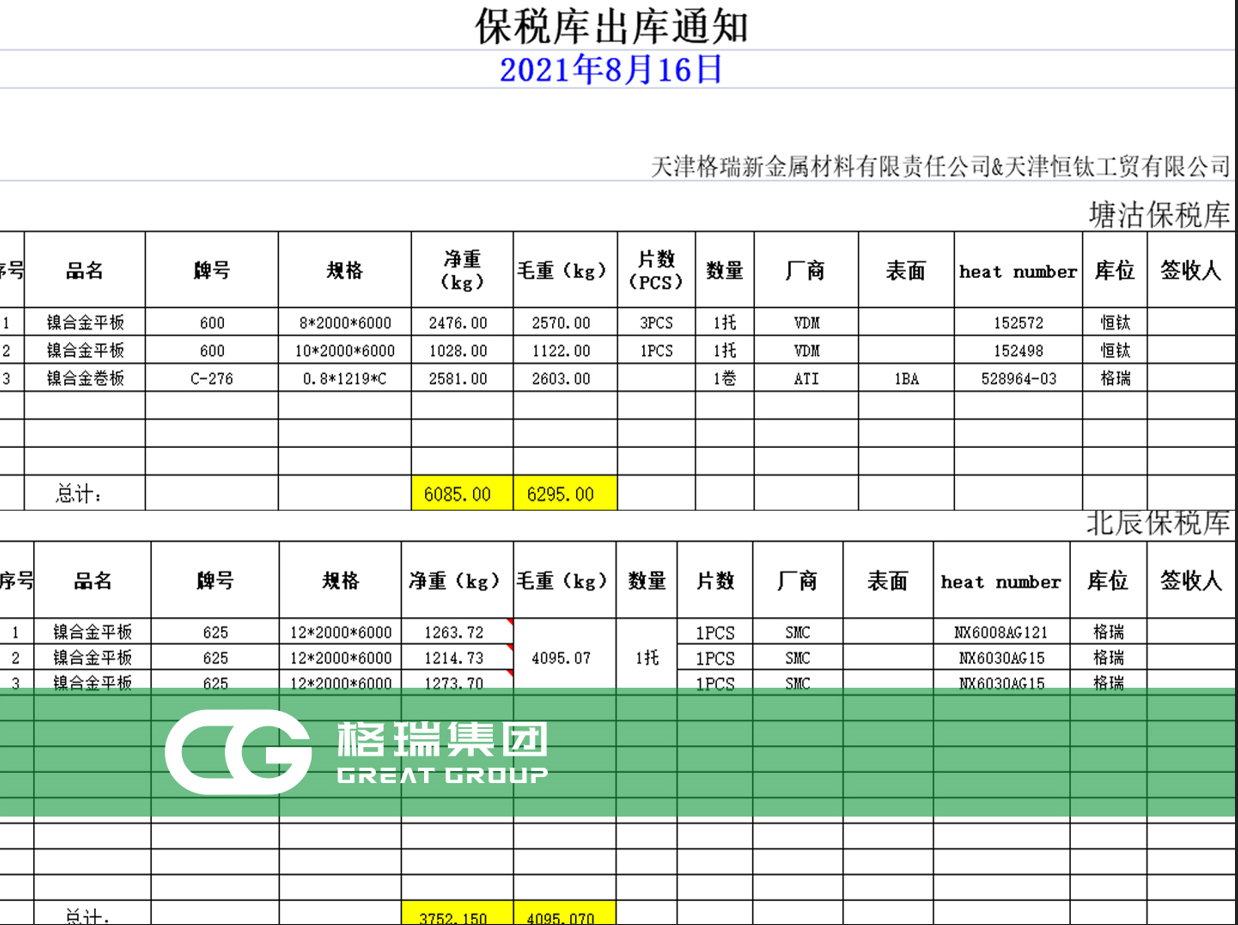 即將到港貨物明細,鎳基合金